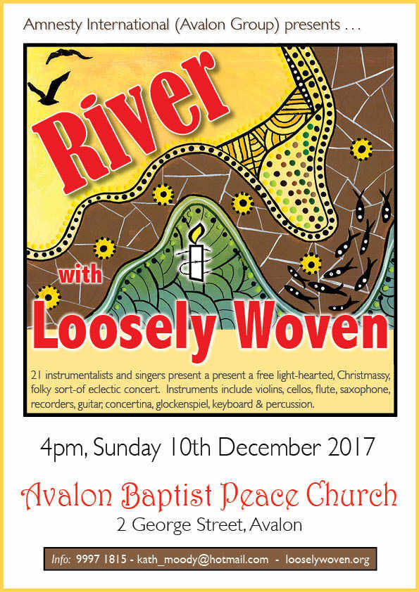 The local music group “LOOSELY WOVEN”, led by Wayne Richmond, will be giving a free community concert in Avalon Baptist Church (2 George St.) on Sunday 10th Dec. at 4 p.m