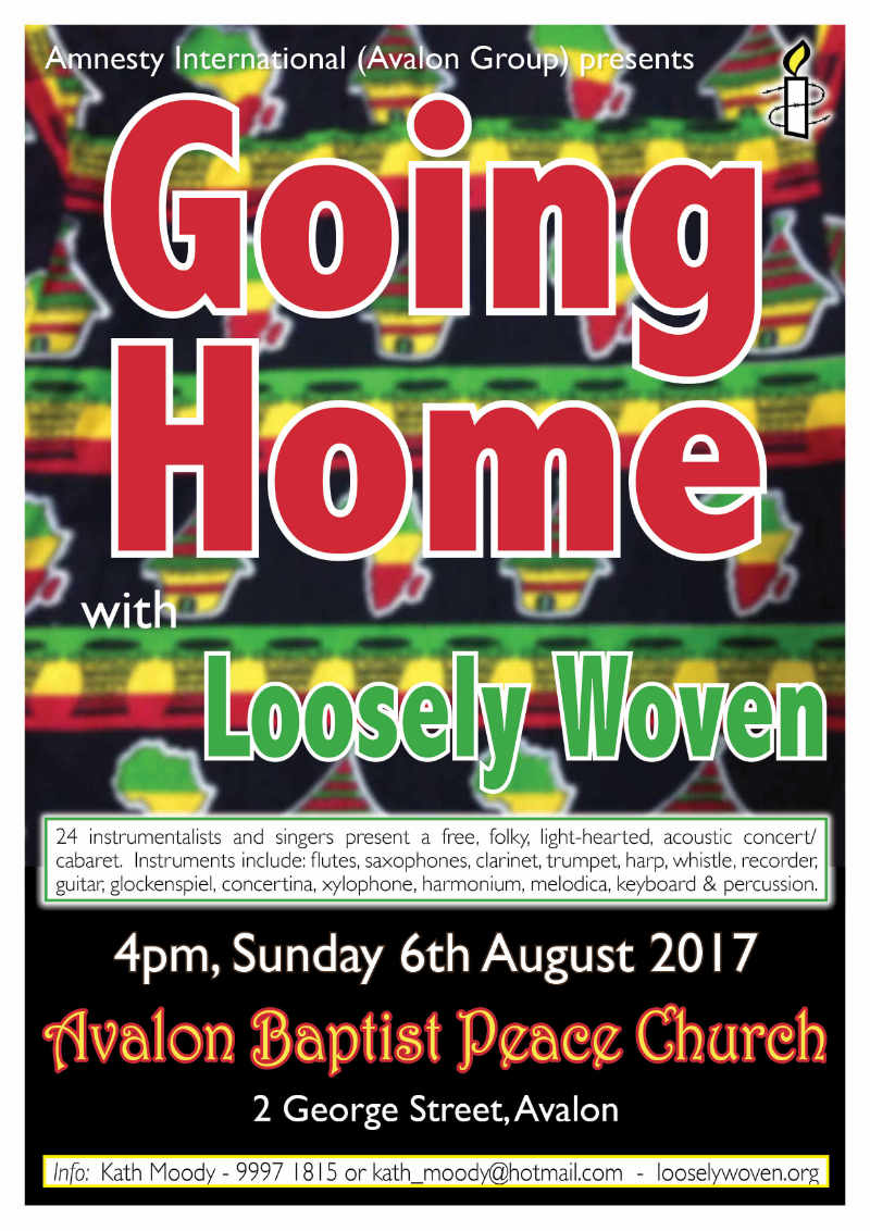 The local music group “LOOSELY WOVEN”, led by Wayne Richmond, will be giving a free community concert in Avalon Baptist Church (2 George St.) on Sunday 6th Aug at 4 p.m