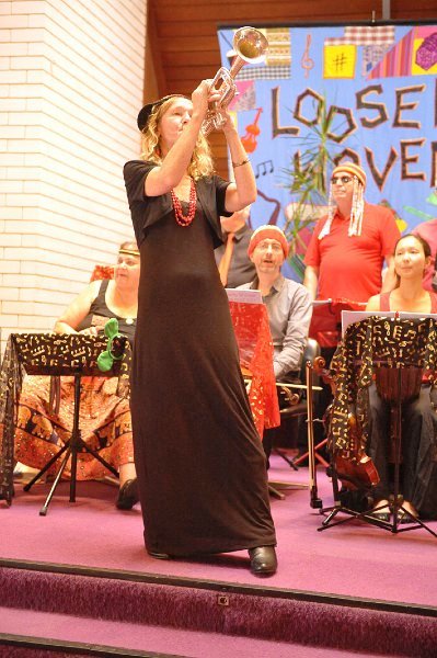 Indeed, Cathy and her mother Jan have settled nicely into the fold, subbing very capably for missing members of the ensemble on recorders and piano respectively. Jan added a lovely xylophone solo to Roy Orbison’s “Crying” while Cathy bossed the hall with her reprise of the Bob Marley charmer “Three Little Birds”. She and Samantha O’Brien made a formidable horn/woodwind section; similarly, violinists Stephen Malloch and Kazu Milne were positively symbiotic on this their first pairing in a Loosely Woven context.